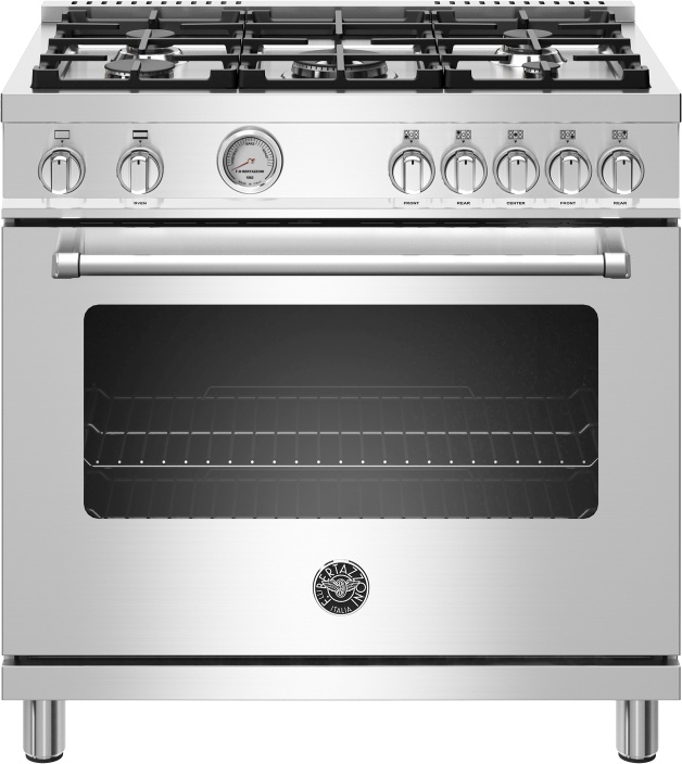 The 5.9 cubic feet oven cavity is the largest in its class, with dual convection fan for balanced airflow and even temperature baking and roasting on 7 shelf levels. The elegant large temperature gauge monitors the actual temperature in the oven. The extra wide infrared gas broiler is ideal for grilling and searing at high heat. The oven features soft-motion door. Smooth telescopic glides are available as accessory. The edge-to-edge interior oven glass door maximizes interior volume and can be wiped clean without effort.