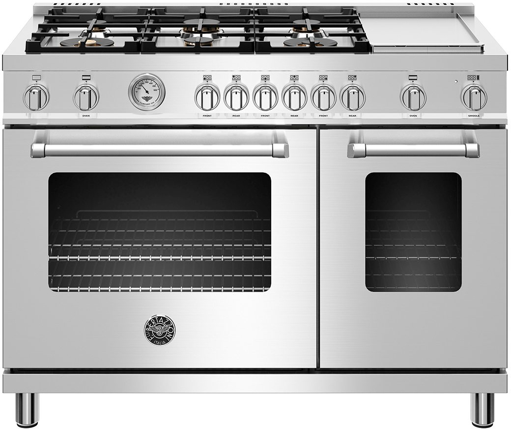 The high-efficiency maintop with 6 brass burners and electric griddle features 2 dual ring 19,000 BTU power-burners that boil water in under 6 minutes (best in class), and 4 additional MonoBloc burners of variable size and power to suit every style of cooking, with delicate simmer at 750 BTUs. The stainless steel griddle with integrated cover provides additional cooking options.