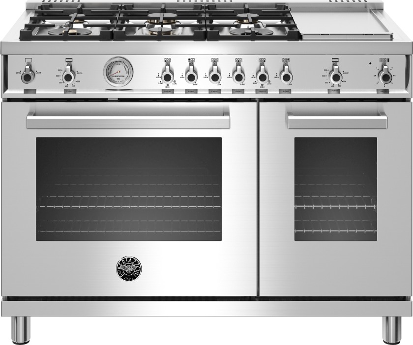 The 4.8 cubic feet main oven cavity is the largest in its class, with dual convection fan for balanced airflow and even temperature baking and roasting on 7 shelf levels. The elegant large temperature gauge monitors the actual temperature in the oven. The extra wide infrared gas broiler is ideal for grilling and searing at high heat. The 2.4 cubic feet auxiliary oven is perfect for smaller dishes and for warming. Both ovens include convenient features such as smooth telescopic glides for the oven shelves and soft-close doors. The edge-to-edge interior oven glass door maximizes interior volume and can be wiped clean without effort.