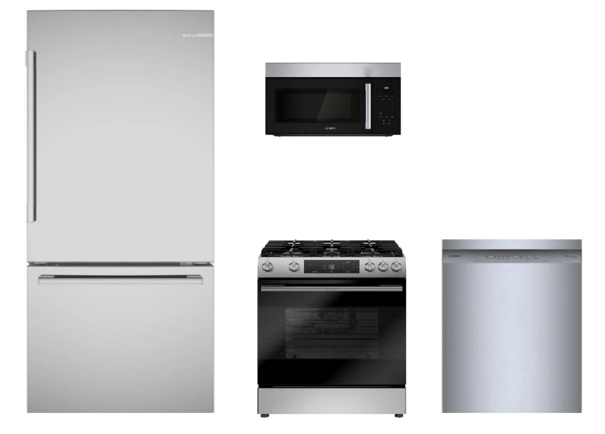 Bosch 4 Piece Stainless Steel Kitchen Package with a bottom mount refrigerator, slide in electric range, built in dishwasher, and over the range microwave.Read More
