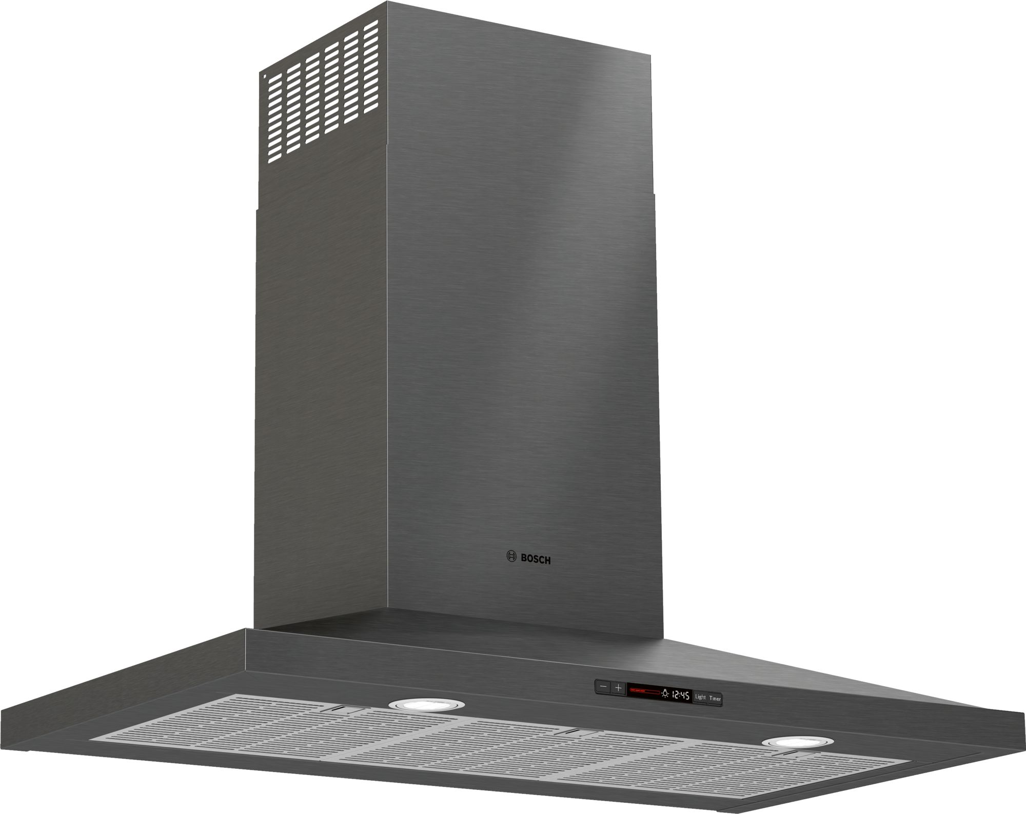 The 36" Bosch black stainless steel chimney hood helps guard against scratches and fingerprints.