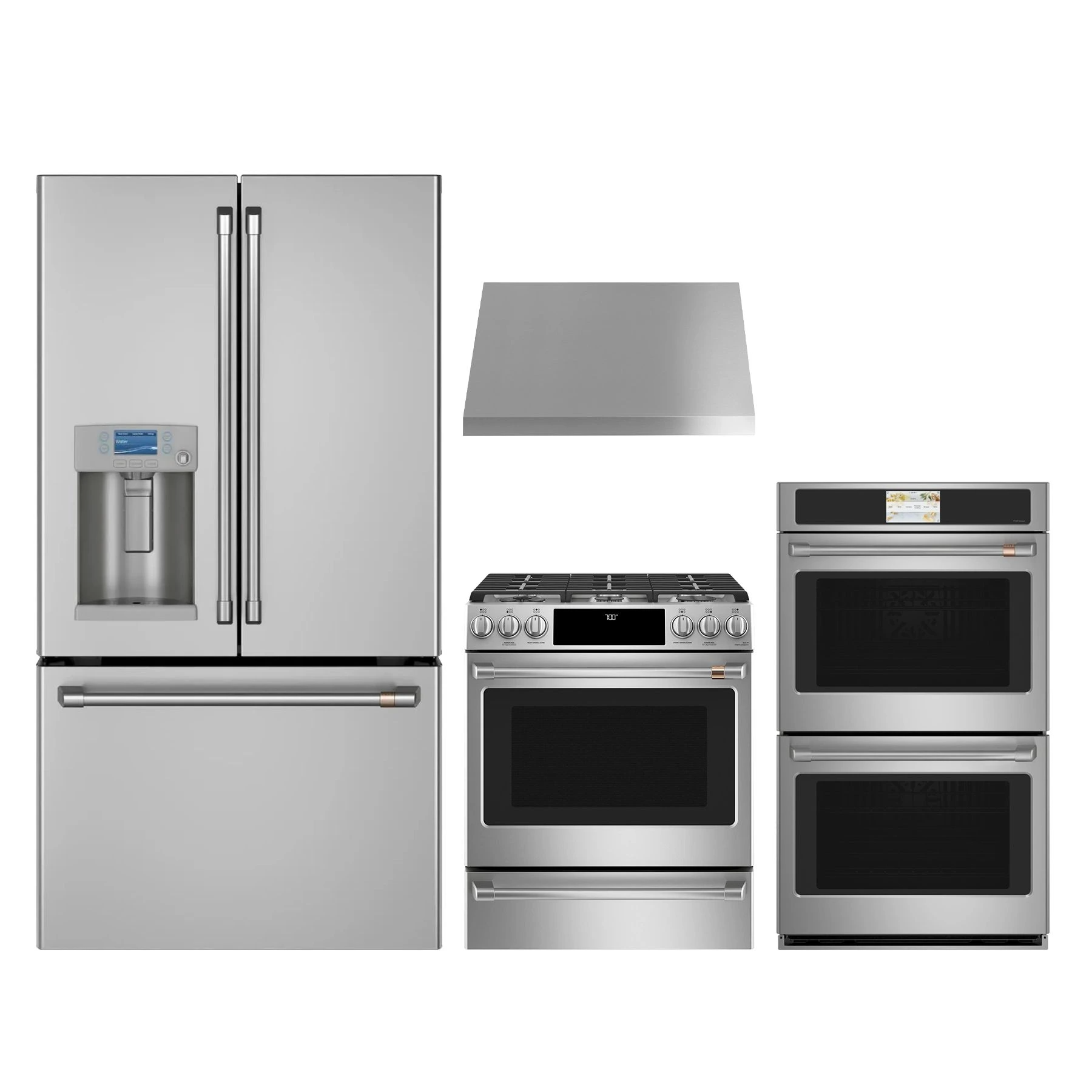 Café™ 4 piece stainless steel kitchen package with slide-in gas range, wall mounted range hood, electric double wall oven, and counter depth French door refrigerator.Read More
