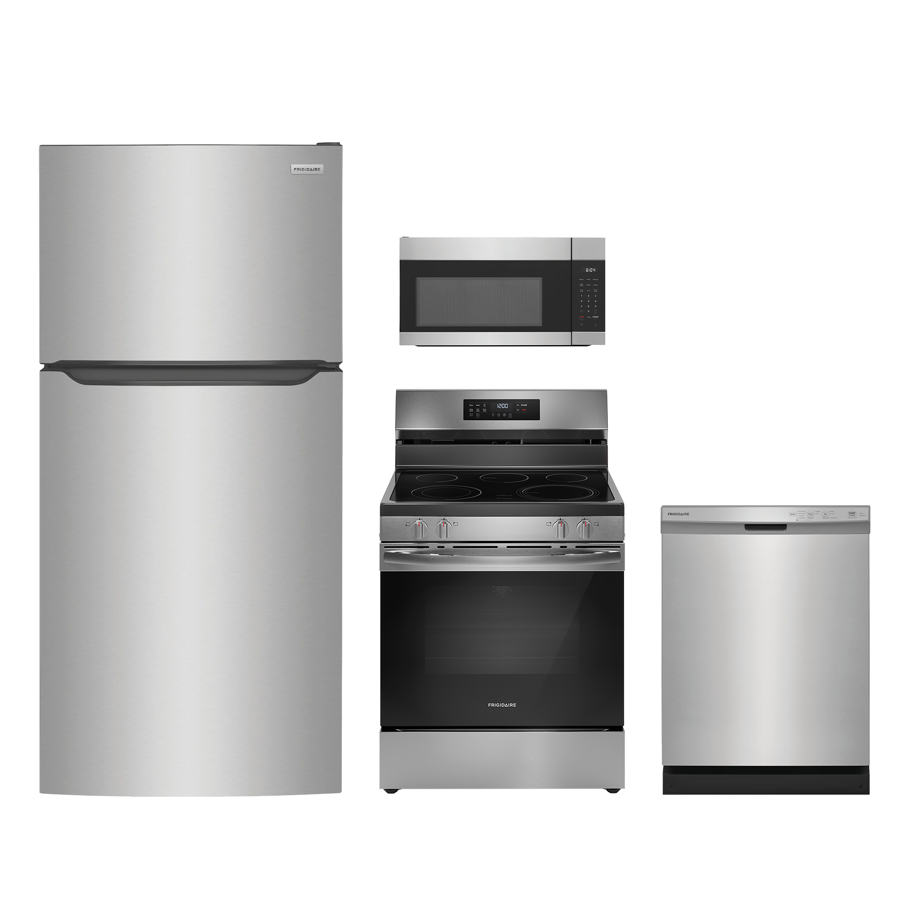 Frigidaire® 4 Piece Stainless Steel Kitchen Package with Top Freezer Refrigerator, Freestanding Electric Range, Built In Dishwasher, and Over The Range Microwave.Read More
