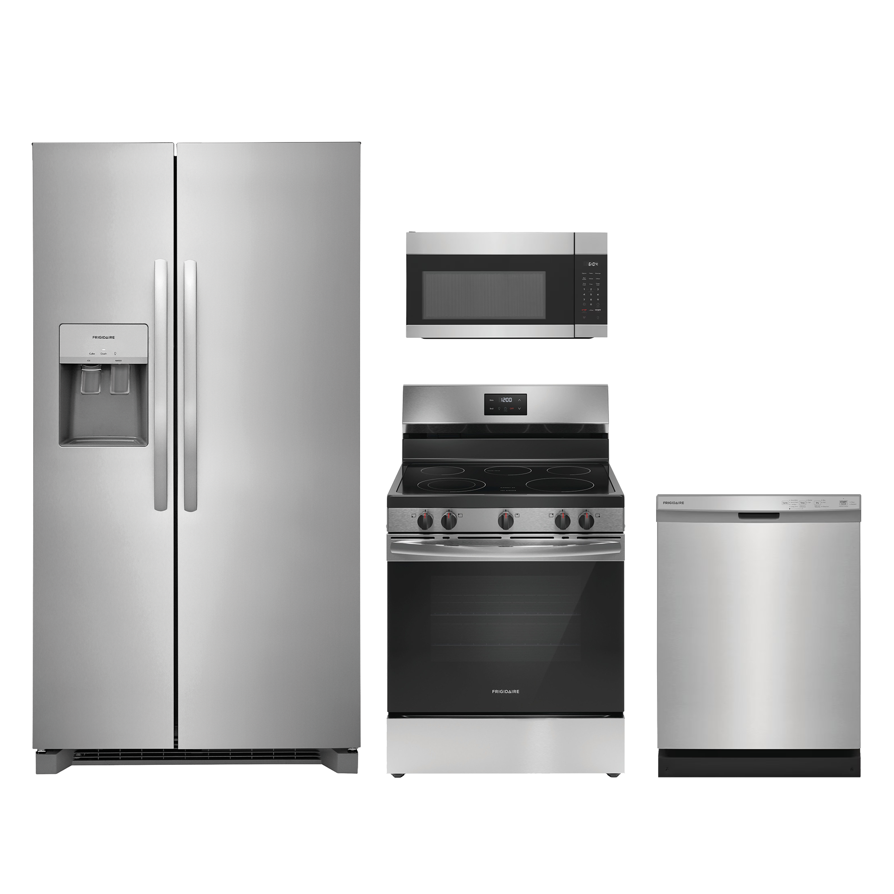 Frigidaire® 4 Piece Stainless Steel Kitchen Package with side-by-side refrigerator, freestanding electric range, built in dishwasher, and over the range microwave.Read More