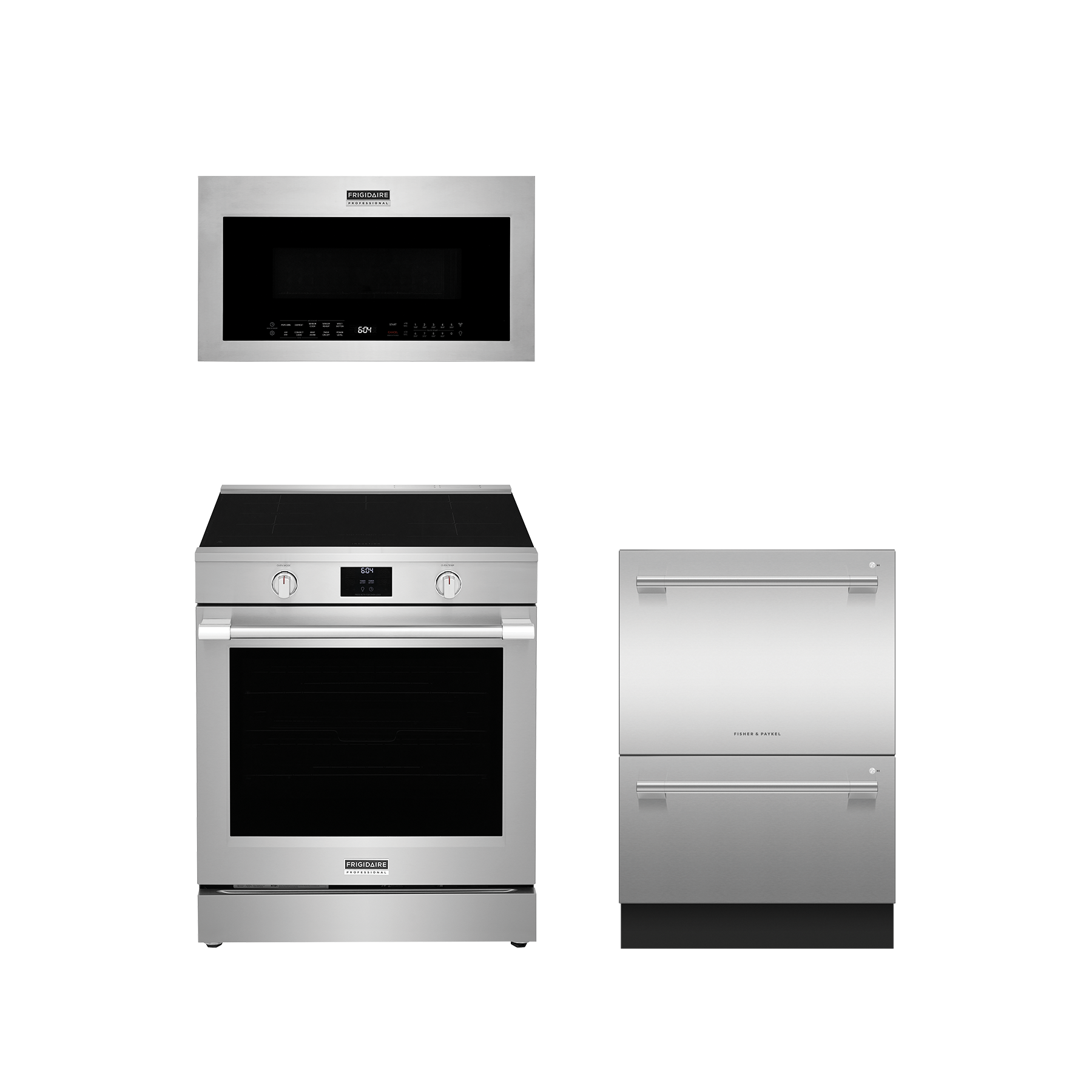 Frigidaire Professional 3 Piece Stainless Steel Kitchen Package with a free standing induction range, over the range microwave, and a Fisher & Paykel double dish drawer.Read More