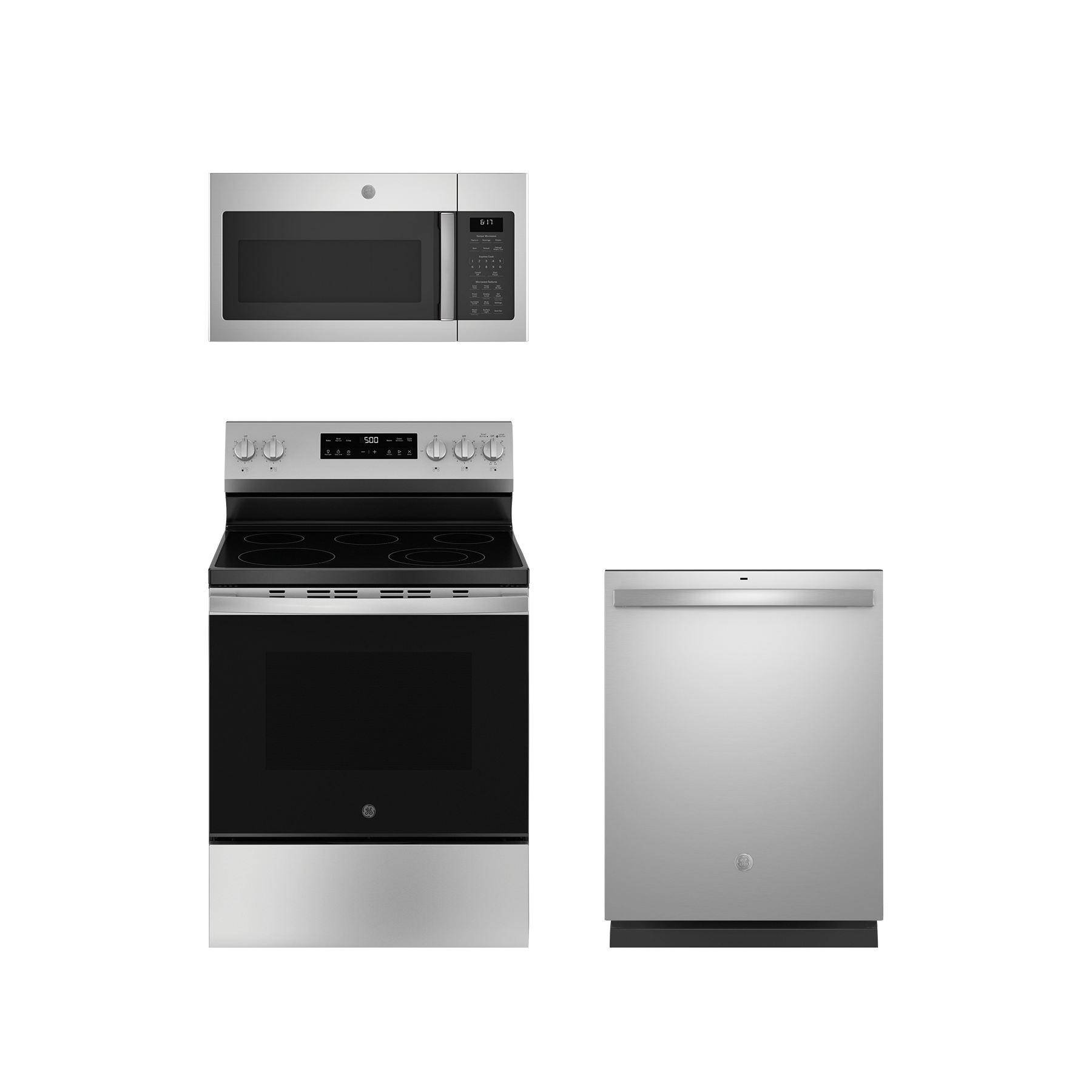GE 3 piece stainless steel kitchen package with 30 inch freestanding electric range, built-in dishwasher, and over the range microwave.Read More