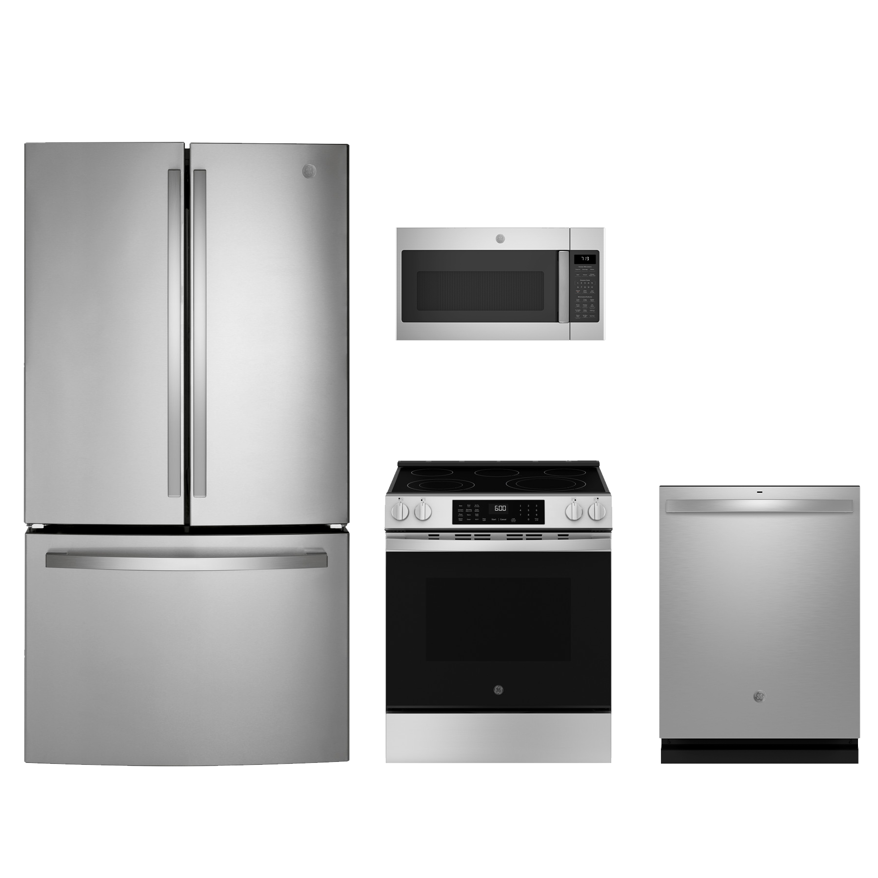 GE® 4 Piece Stainless Steel Kitchen Package with a French door refrigerator, slide-in electric range, over the range microwave and built-in dishwasher.Read More