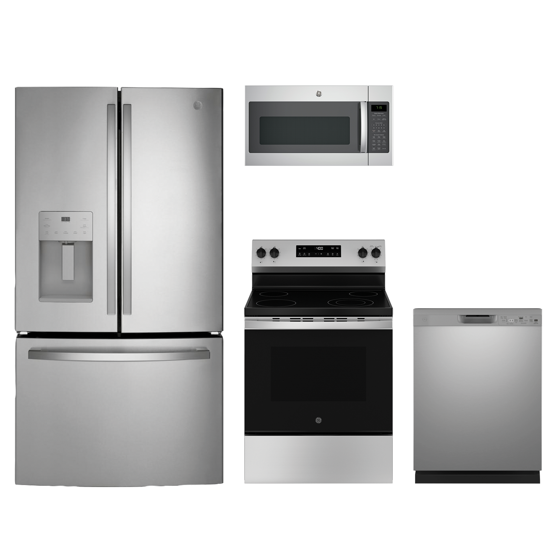 GE® 4 Piece Stainless Steel Kitchen Package with a french door refrigerator, free standing electric range, over the range microwave and built-in dishwasher.Read More