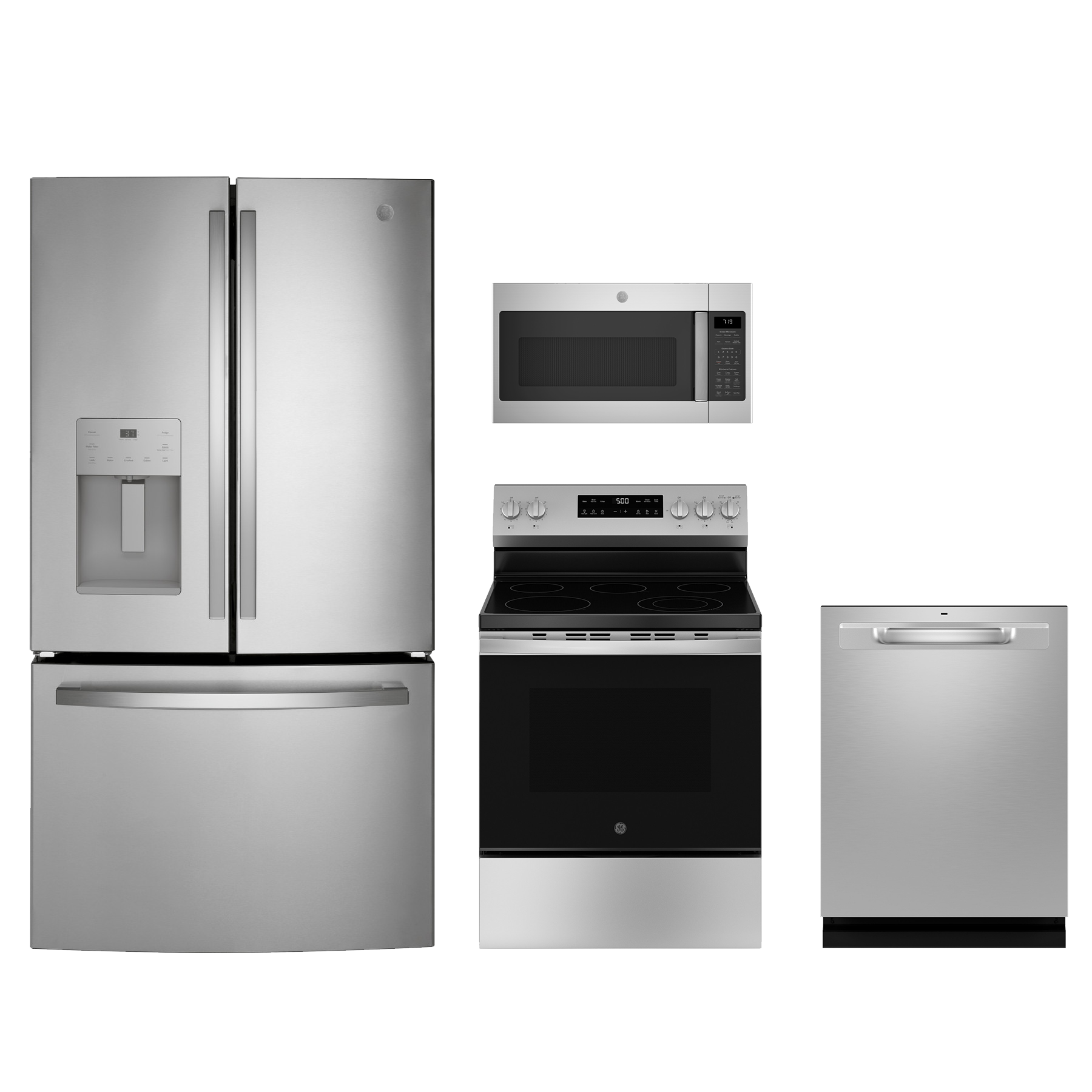 GE® 4 Piece Stainless Steel Kitchen Package with a french door refrigerator, free standing electric range, over the range microwave and built-in dishwasher.Read More
