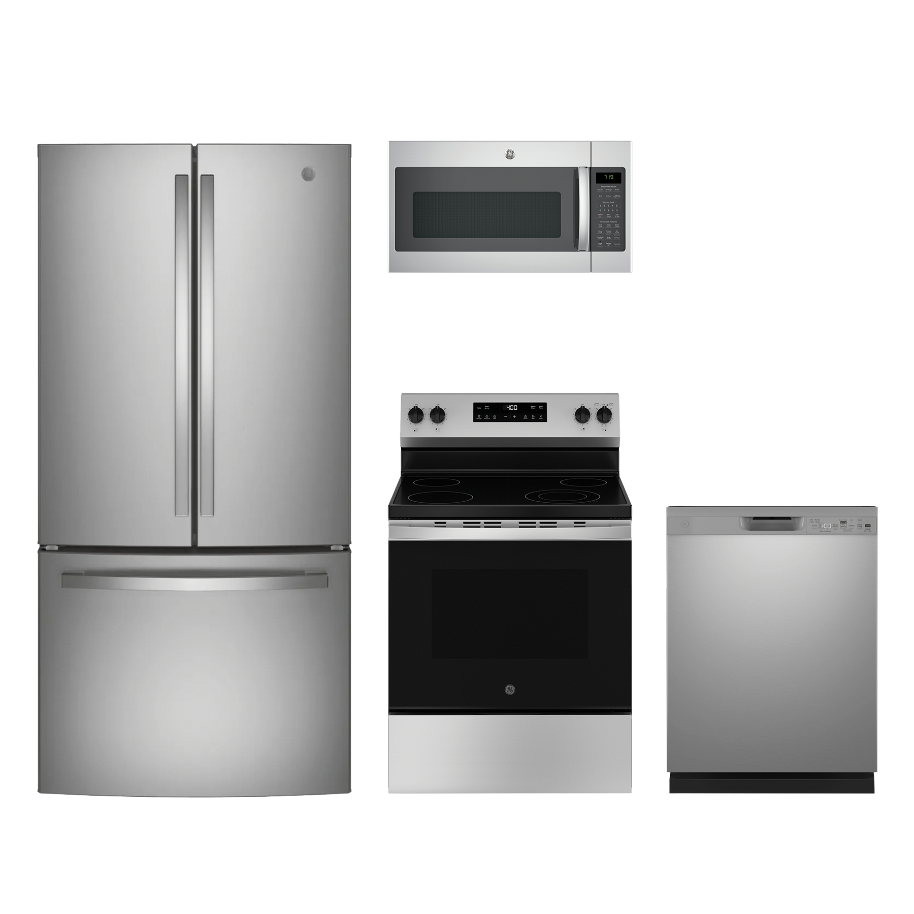GE® 4 Piece Stainless Steel Kitchen Package with a french door refrigerator, free standing electric range, over the range microwave and built-in dishwasher.Read More