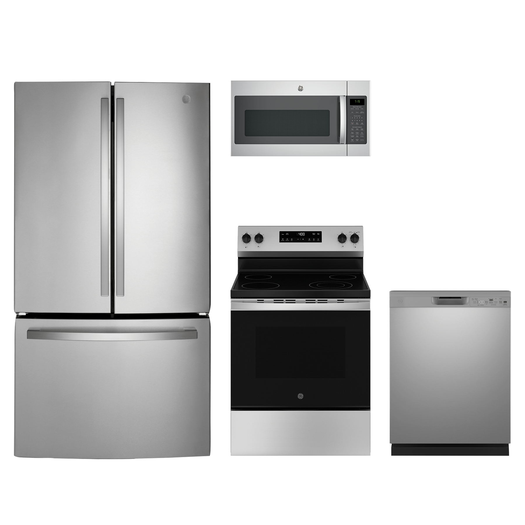 GE® 4 Piece Stainless Steel Kitchen Package with a french door refrigerator, free standing electric range, over the range microwave and built-in dishwasher.Read More