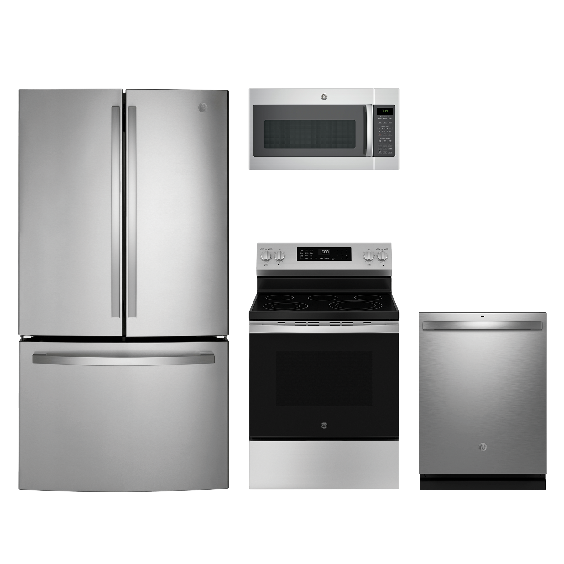 GE® 4 Piece Stainless Steel Kitchen Package with a french door refrigerator, free standing electric range, over the range microwave and built-in dishwasher.Read More