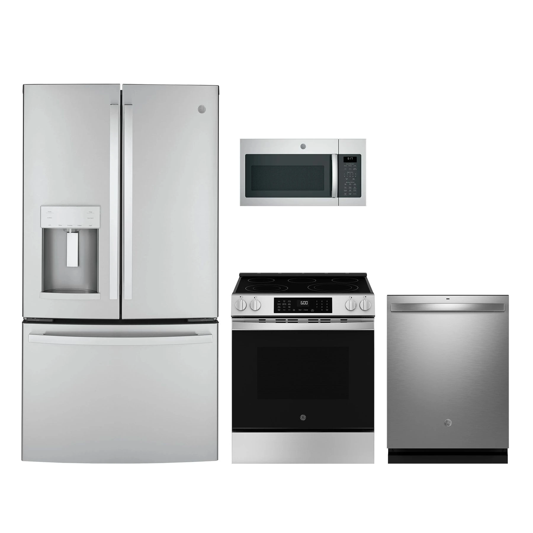 GE 4 Piece Stainless Steel Kitchen Package with a slide-in electric range, built-in dishwasher, over the range microwave, and a counter-depth French door refrigerator.Read More