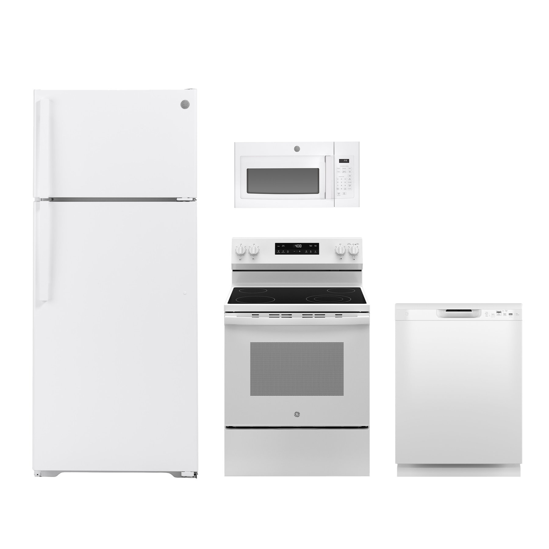 GE® 4 Piece white kitchen package with top freezer refrigerator, freestanding electric range, built in dishwasher and over the range microwave.Read More