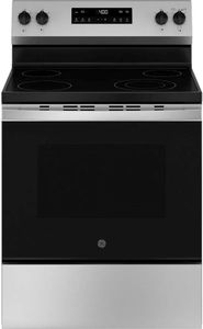 GE® 400 Series 30" Stainless Steel Freestanding Electric Range features 4-Burner Radiant Cooktop, Steam Clean, Dual Element Oven, Oven Storage Drawer, New Easy-to-Use Controls, 4-Pass Bake Element, Halogen Oven Light , Sabbath Mode, and Nickel Racks.Read More