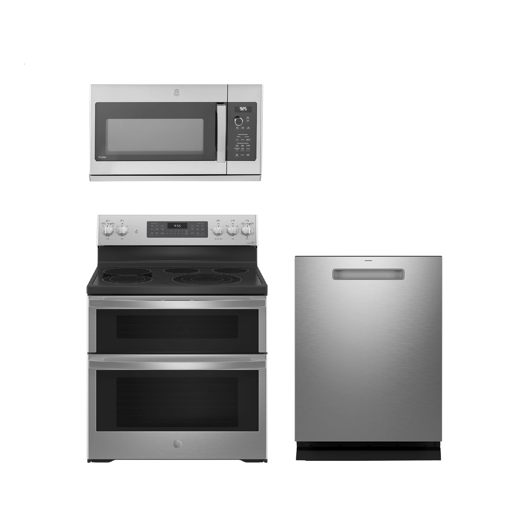 GE Profile™ 3 piece stainless steel kitchen package with a freestanding electric range, built-in dishwasher, and an over the range microwave.Read More
