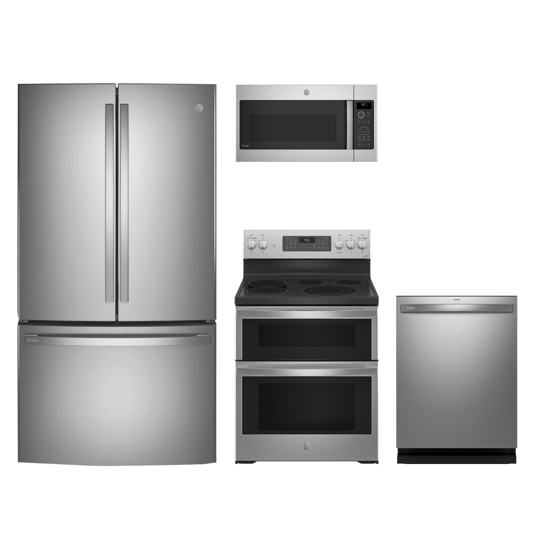 GE Profile™ 4 Piece Stainless Steel Kitchen Package with a french door refrigerator, freestanding electric convection range, over the range microwave and built-in dishwasherRead More