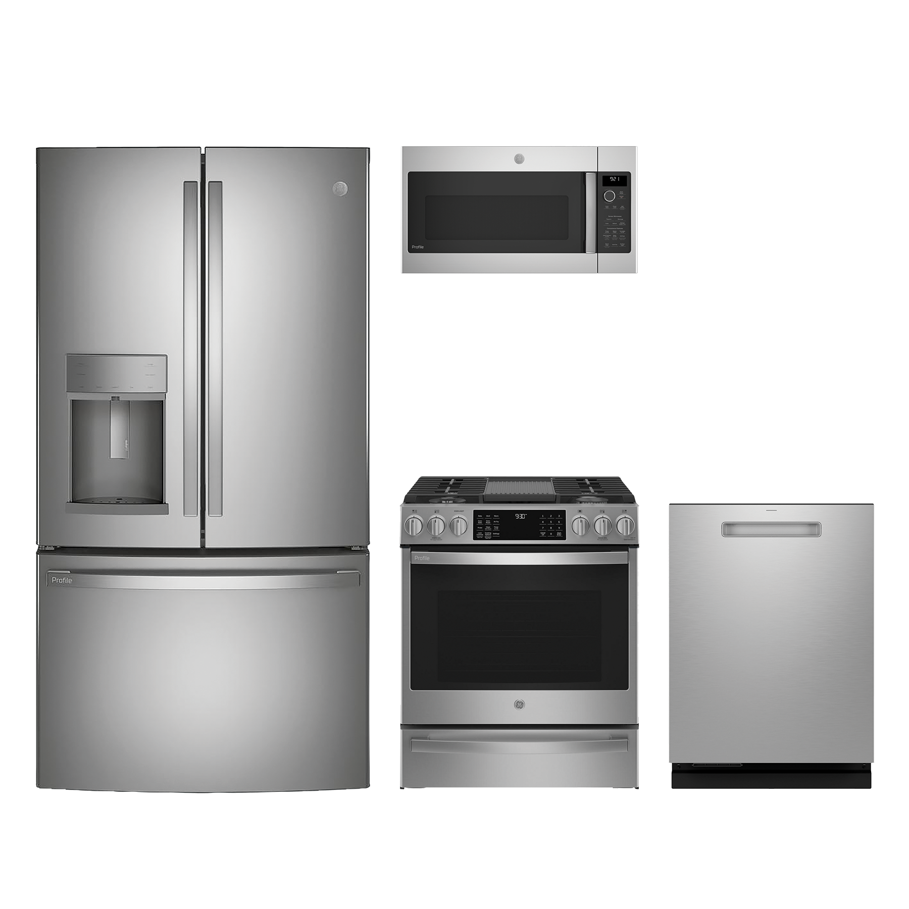 GE Profile™ 4 piece stainless steel kitchen package with slide-in gas range, built-in dishwasher, over the range microwave, and a counter depth French door refrigerator.Read More