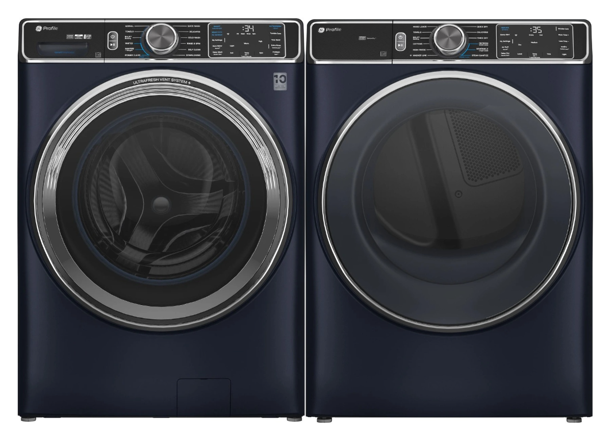 GE Profile™ Sapphire Blue Front Load Laundry Pair with a 5.3 cu. ft. capacity front load washer and a 7.8 cu. ft. capacity front load electric dryer.Read More