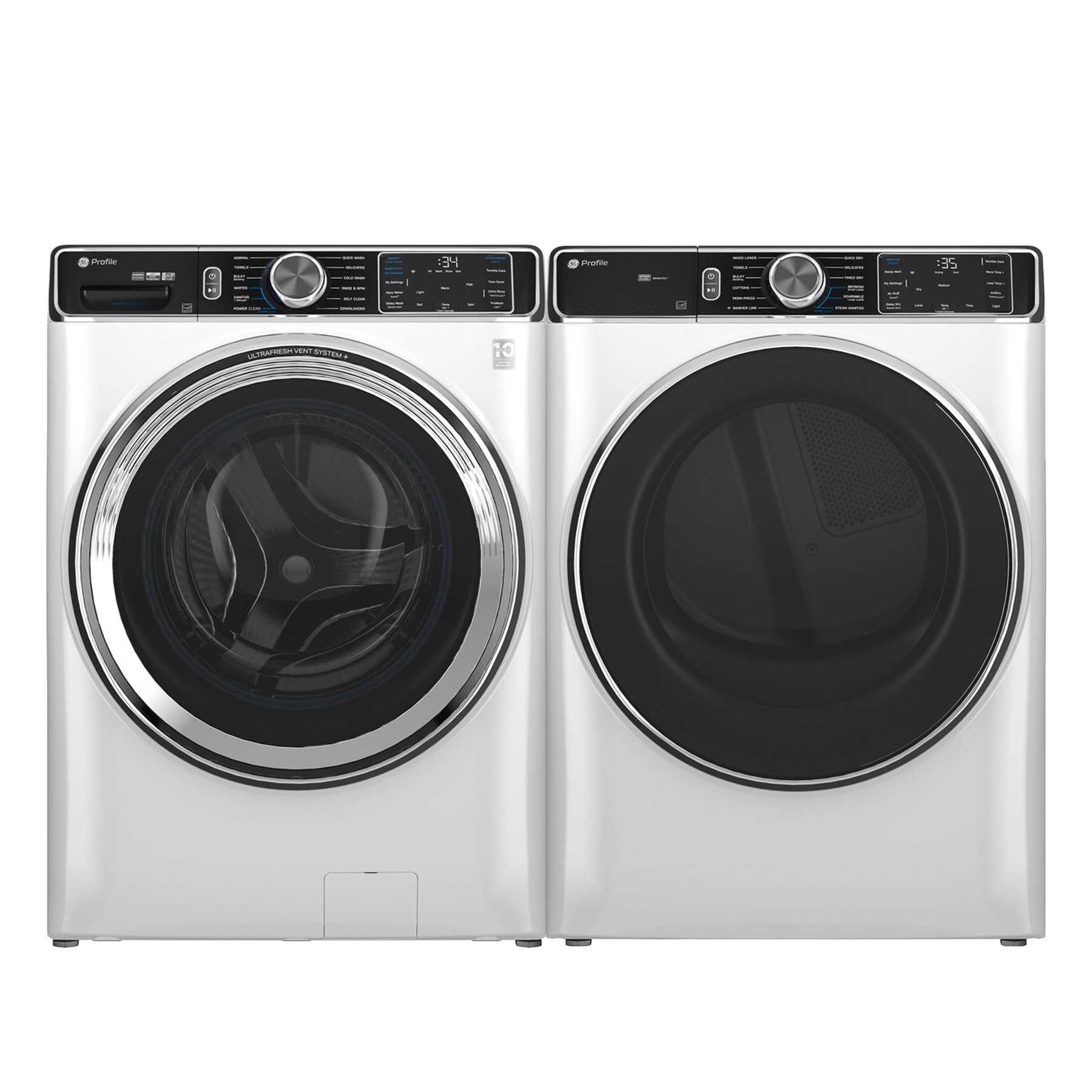 GE Profile™ White Front Load Laundry Pair with a 5.3 cu. ft. capacity front load washer and a 7.8 cu. ft. capacity front load electric dryer.Read More
