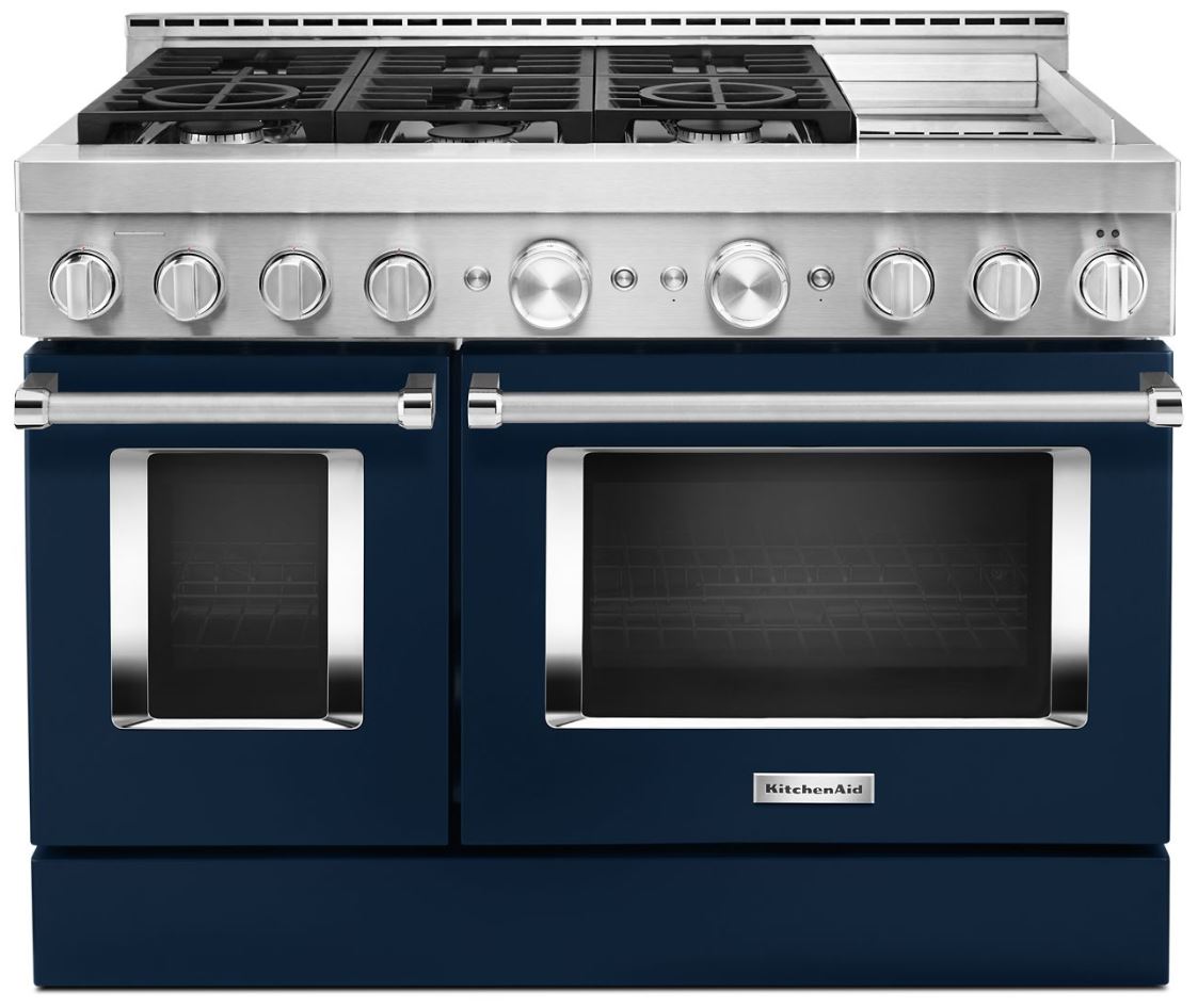 Satisfy your craving to create with a 48-inch KitchenAid® Commercial-Style Range with Even-Heat™ Chrome Electric Griddle. This 6-burner gas range features two versatile 20,000 BTU Ultra Power™ Dual-Flame Burners with the power and precision to successfully sear, simmer, stir-fry and saute´. The double oven with Even-Heat™ True Convection helps you achieve more consistent baking and roasting.Read More