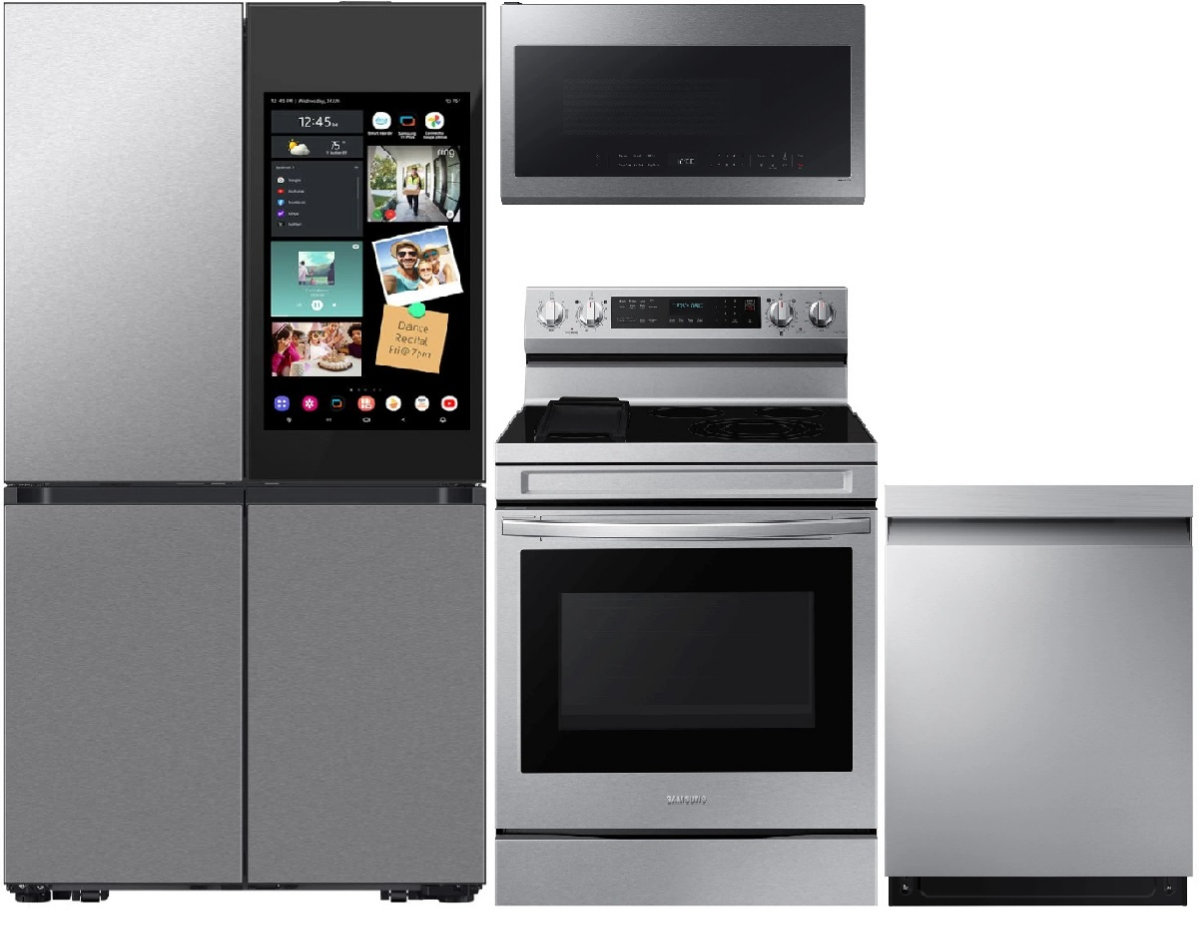 Samsung 4 Piece stainless steel kitchen package with a French door refrigerator, freestanding electric range, top control dishwasher and over the range microwave.Read More