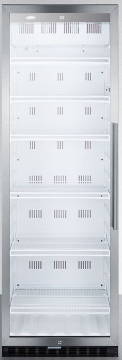 SUMMIT's commercially approved beverage merchandisers are designed for durable service, convenient use, and attractive presentation. SUMMIT SCR1400WLH offers 12.6 cu.ft. of storage space in a slim-fitting footprint just under 24". Bottles and cans can be stored on six heavy duty wire shelves, with fifteen glide options to accommodate different sizes. LED lighting offers full illumination of stored products and a digital thermostat makes temperature control as simple as touching a button. The readout can be viewed in Celsius or Fahrenheit. The frost-free SCR1400WLH features a tempered heat-safe glass door trimmed in stainless steel, with a keyed lock for added security. The stainless steel trimmed glass door includes a pro style handle to complete the modern look, with a self-closing mechanism to ensure items aren't accidentally exposed to warm air. This unit has a left hand door swing. For a right hand version, see the SCR1400W. This model has a white cabinet and a right angle plug for an easier fit. It meets UL-471 commercial standards and is ETL-S listed to NSF standards for use in any commercial foodservice establishment. For this same unit with a stainless steel exterior, see the SCR1400WLHCSS. NOTE: This is an indoor refrigerator and is not designed for use in the outdoors.