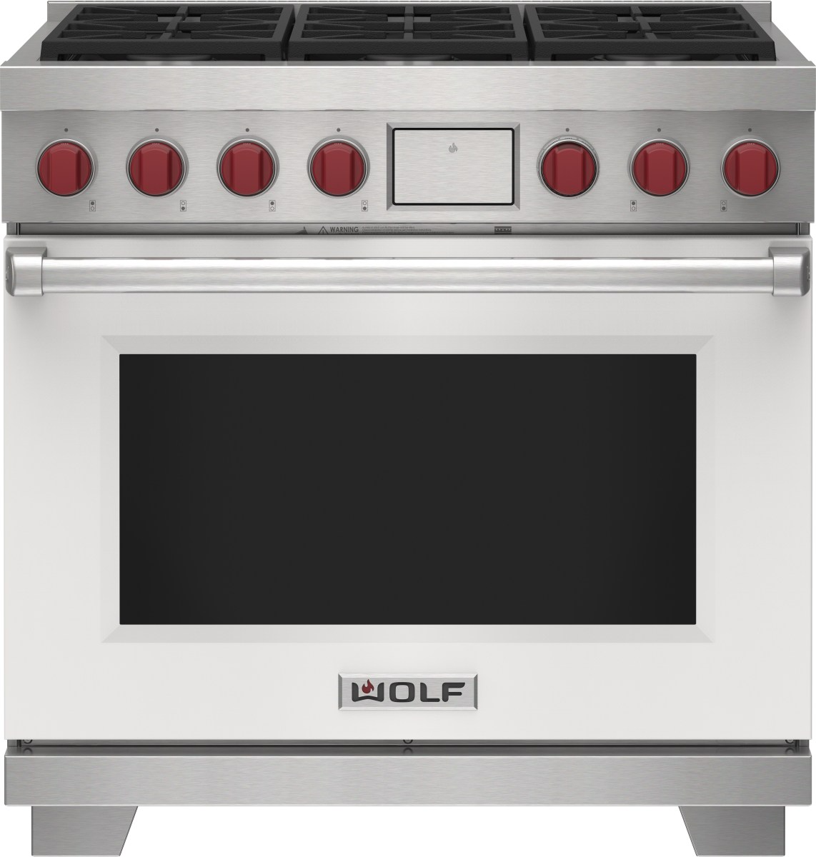 Wolf® 36" Stainless Steel Pro Style Dual Fuel Range with White Door features dual-stacked, sealed burners, Dual VertiFlow™ convection system, Gourmet Mode, 10 chef-created cooking modes, LED backlit control bezels, self-clean, delayed start, timed cook, and Sabbath features.Read More