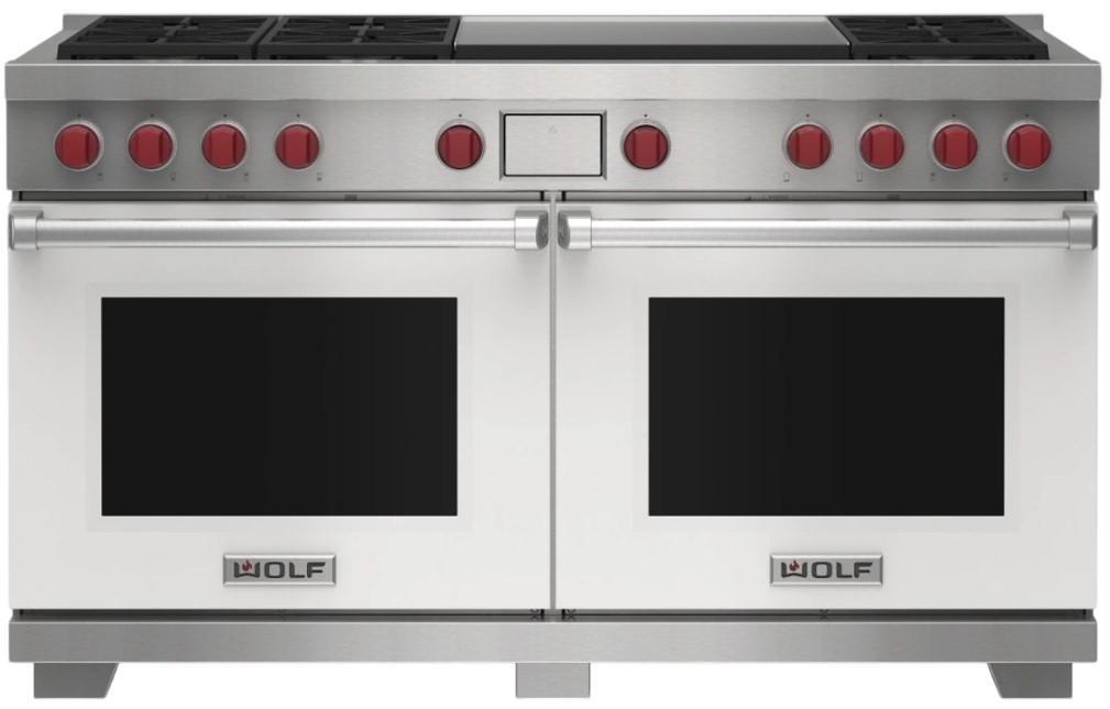 Wolf® 60" Stainless Steel Pro Style Dual Fuel Range with White Door features dual-stacked, sealed burners, Dual VertiFlow™ convection system, Gourmet Mode, 10 chef-created cooking modes, LED backlit control bezels, self-clean, delayed start, timed cook, and Sabbath features.Read More