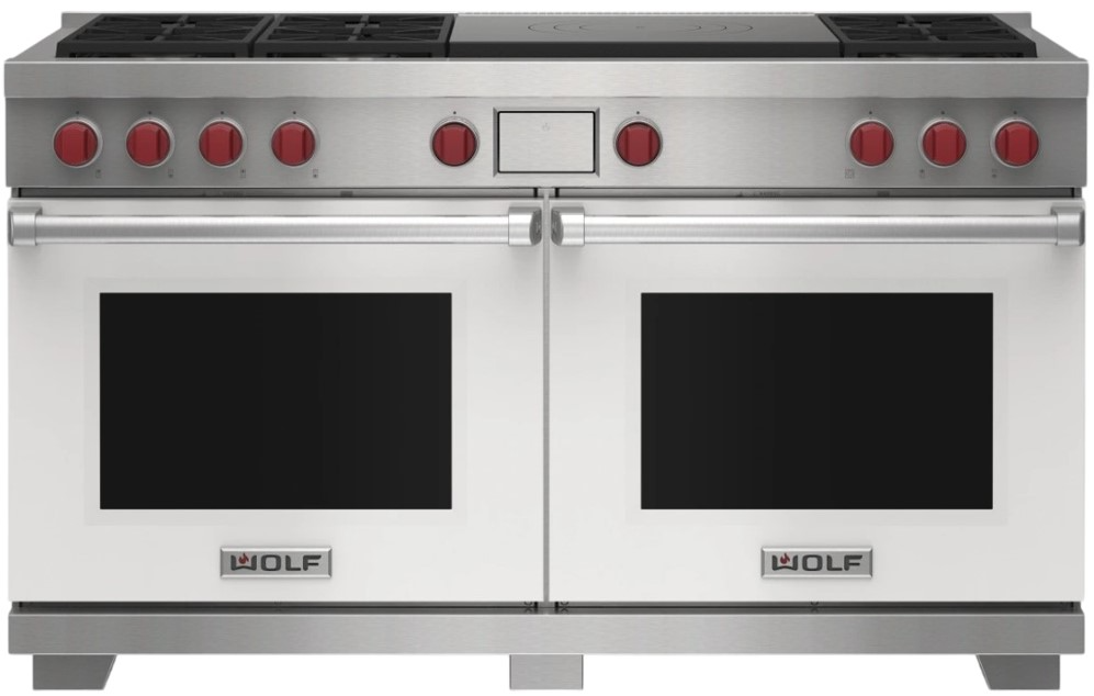 Wolf® 60" Stainless Steel Pro Style Dual Fuel Range with White Door and French Top features dual-stacked, sealed burners, Dual VertiFlow™ convection system, Gourmet Mode, 10 chef-created cooking modes, LED backlit control bezels, self-clean, delayed start, timed cook, and Sabbath features.Read More
